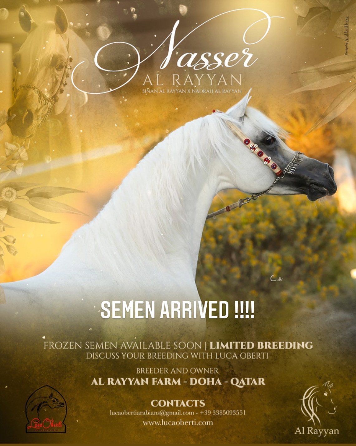 Nasser Al Rayyan Frozen Semen arrived in Italy ! Limited Number of Breeding available ! Contact us today to finalize once in a life time opportunity !